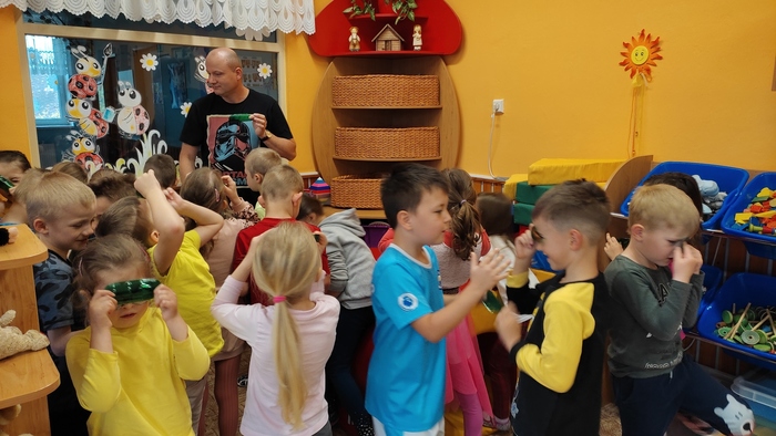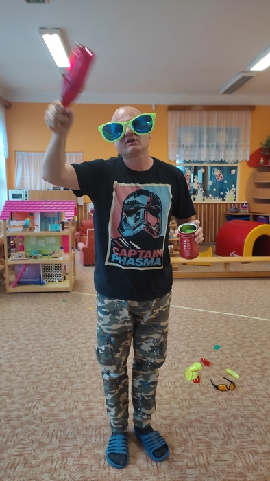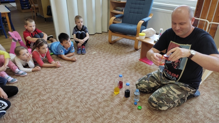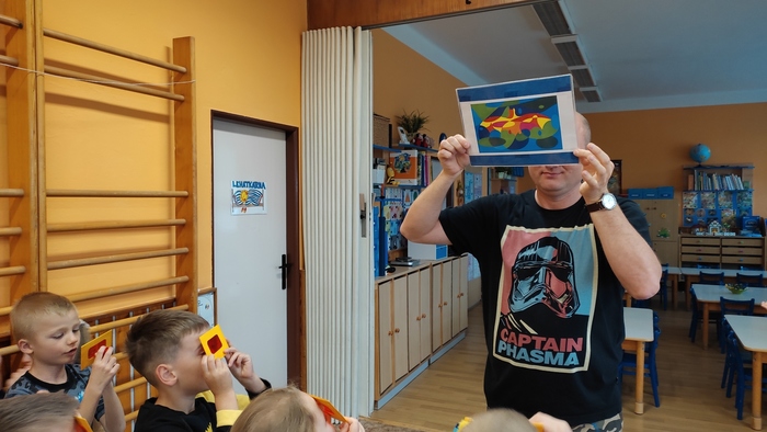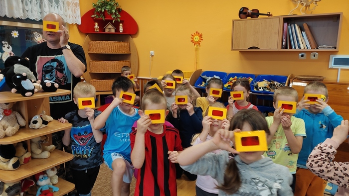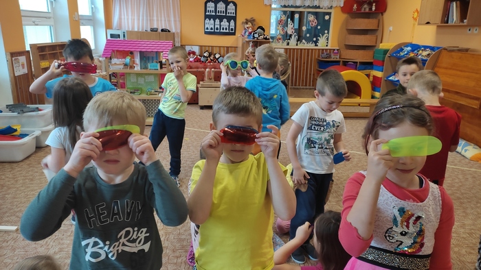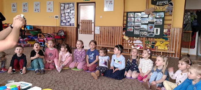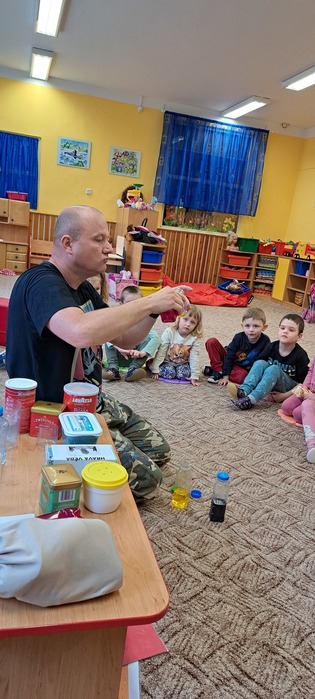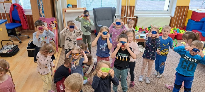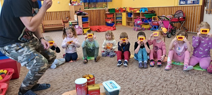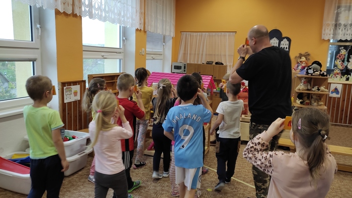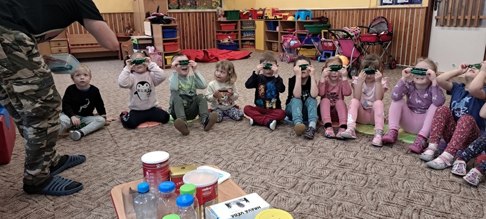 V úterý 16. 4. 2024 byl pozván do školky pan Mgr. Radek Chajda. Je nejen vystudovaným učitelem M-F, ale také autorem pěkné řádky populárně-naučných knih pro děti. Tématem vzdělávacího programu byly tentokrát barvy. Již první slova a provedené pokusy děti plně upoutaly. Zajímavou a hravou formou děti poznávaly a rozlišovaly barvy, zkoumaly je a také se seznamovaly se vznikem barev vlivem míchání. Pozorovaly světelné jevy, s barvami experimentovaly a pobavily se při pozorování okolního světa za pomoci barevných brýlí. I ty nejmenší děti byly činnostmi zaujaté a měly z experimentování a poznávání radost!